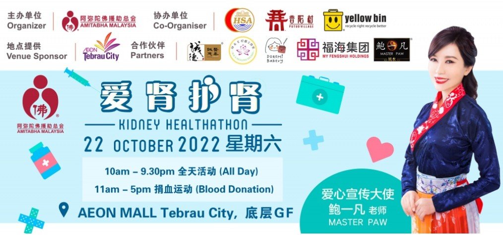 由阿弥陀佛援助总会主办的肾脏醒觉健康活动【爱肾护肾 健康人生】,定于10月22日于新山AEON Mall Tebrau City盛大举行,期盼借由活动,唤醒民众对健康的关注与社会互助精神。